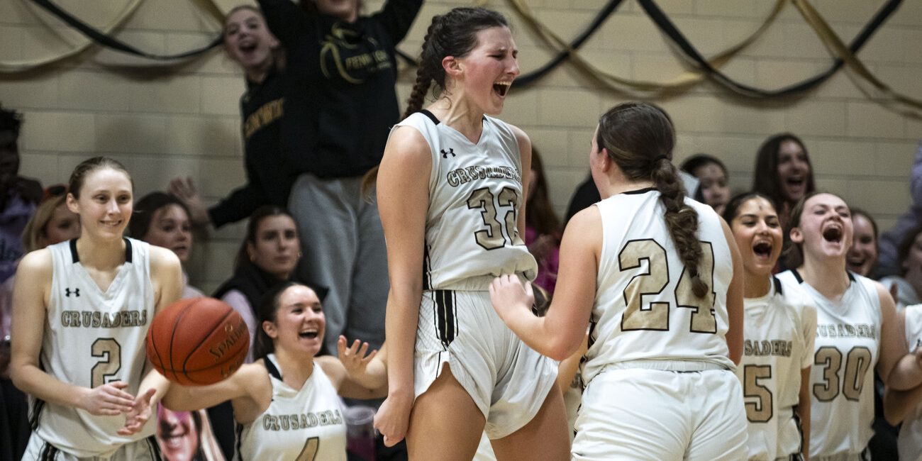 With a packed house at Fenwick High, the host Crusaders got the better of St. Mary’s, 57-49, to complete a two-game season sweep.